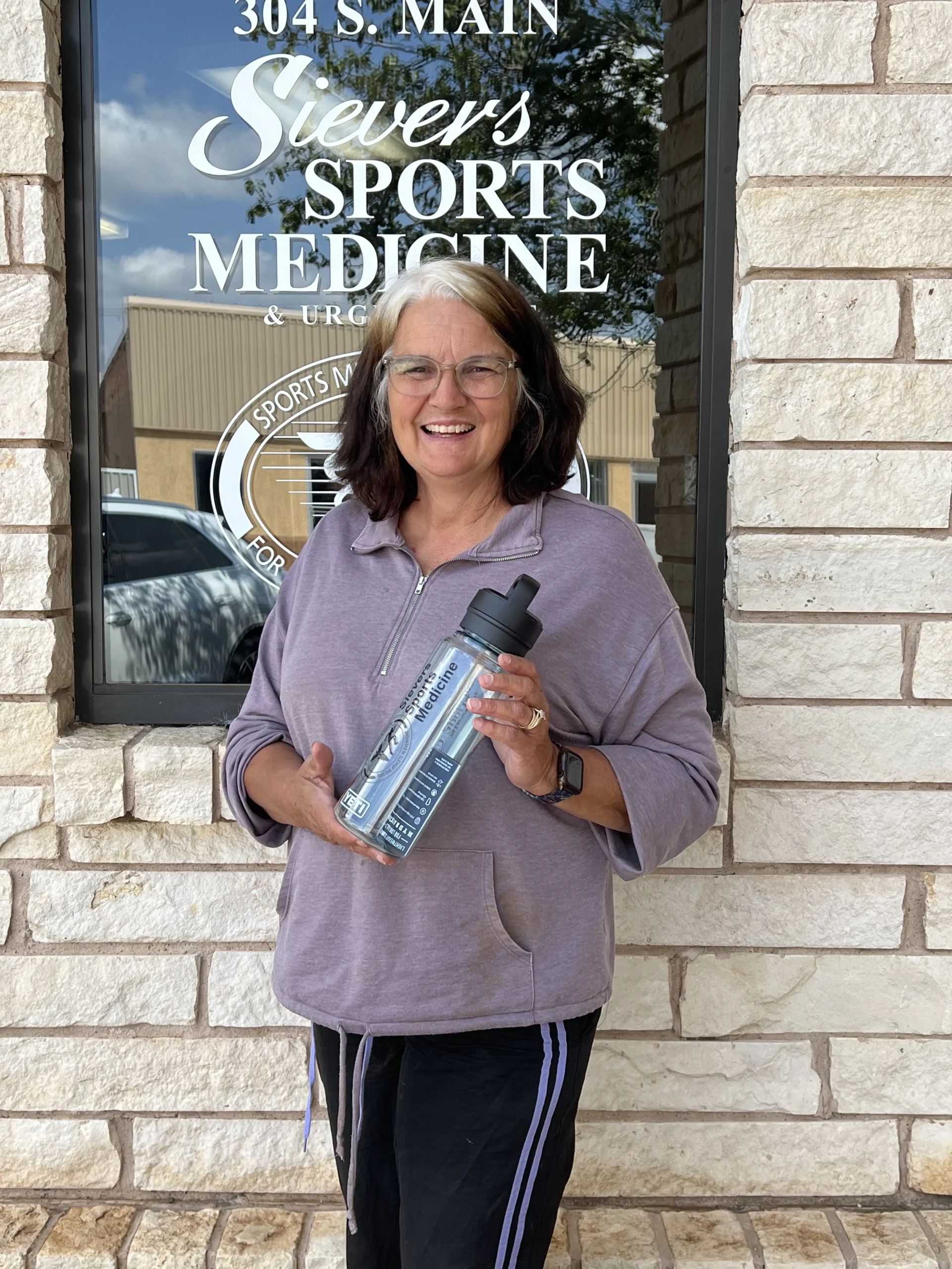 Our excited June winner! We draw a winner each month who gets a super amazing custom Yeti bottle. Enter to win by sharing your experience at Sievers Sports Medicine in a Google review.